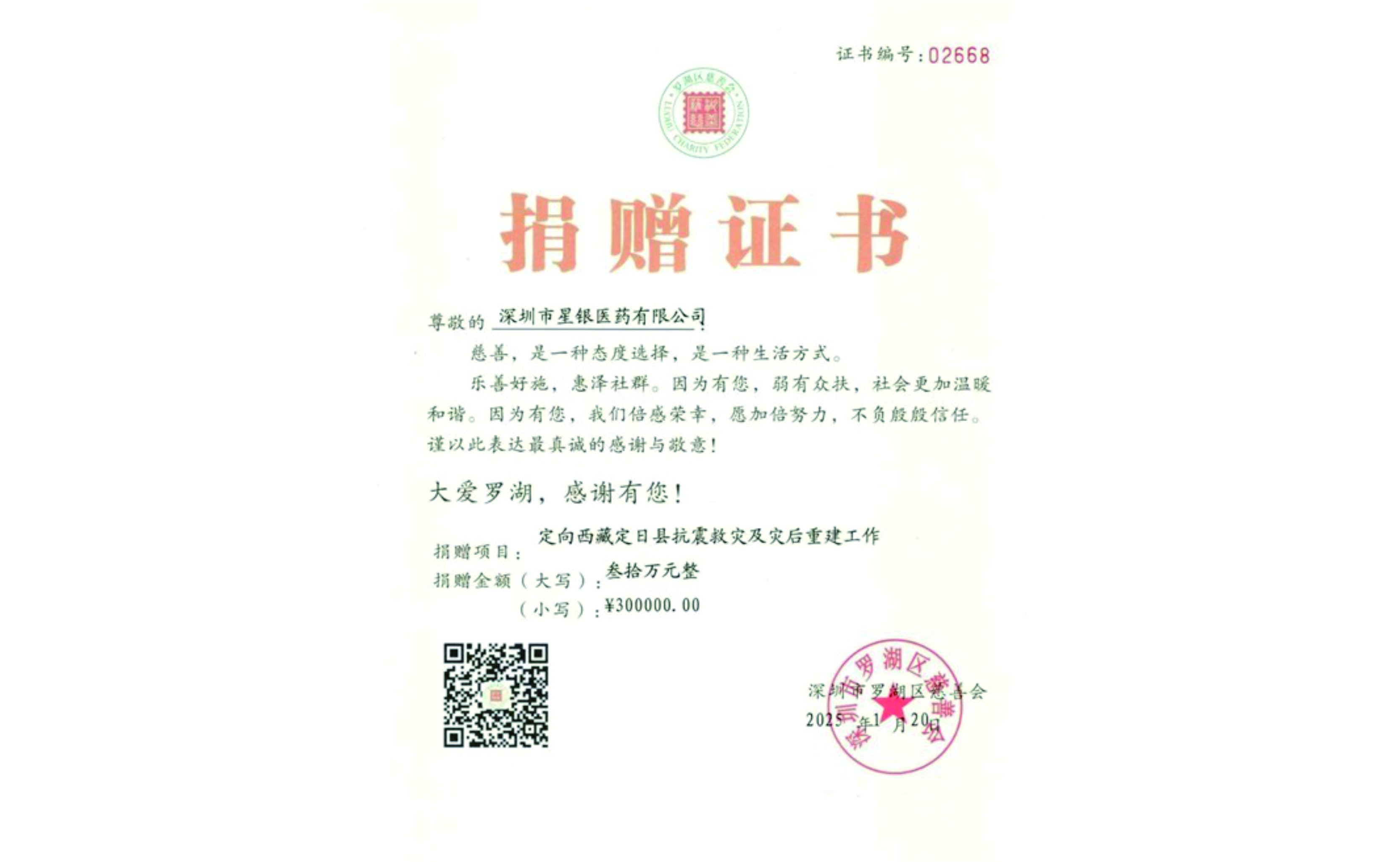 25/06-13On January 7, a magnitude 6.8 earthquake hit Dingri County, Shigatse City, Xizang, causing heavy casualties and a large number of houses collapsed. After the disaster occurred, Xingyin Medicine immediately paid attention to the situation in the disaster area and donated 300000 yuan in cash through the Luohu District Charity Association in Shenzhen to support the earthquake relief and post disaster reconstruction work in Shigatse.